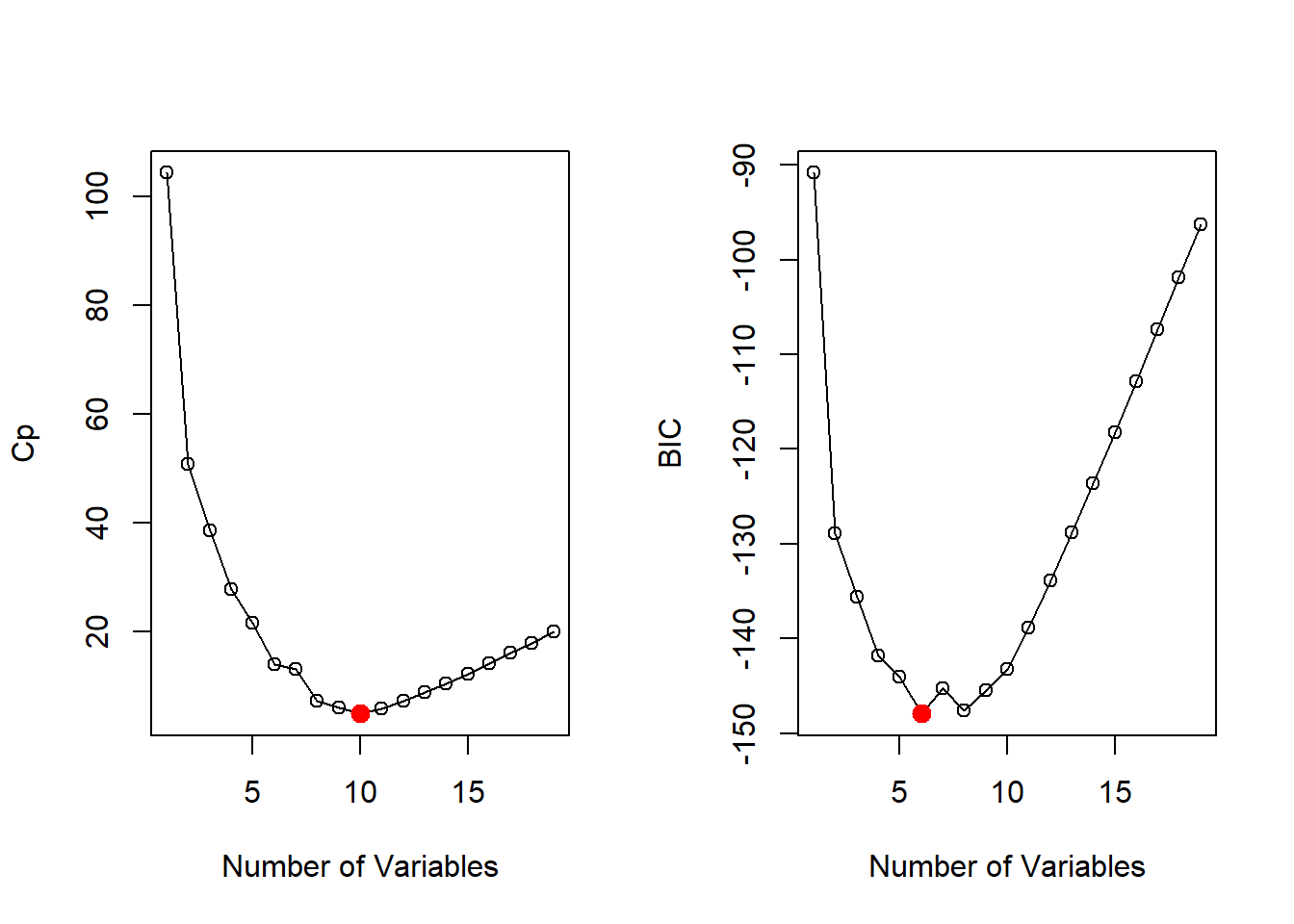 De manera similar, dibujamos los valores de los estadísticos \(C_p\) y \(BIC\), e indicamos los modelos con el estadístico más pequeño usando which.min().